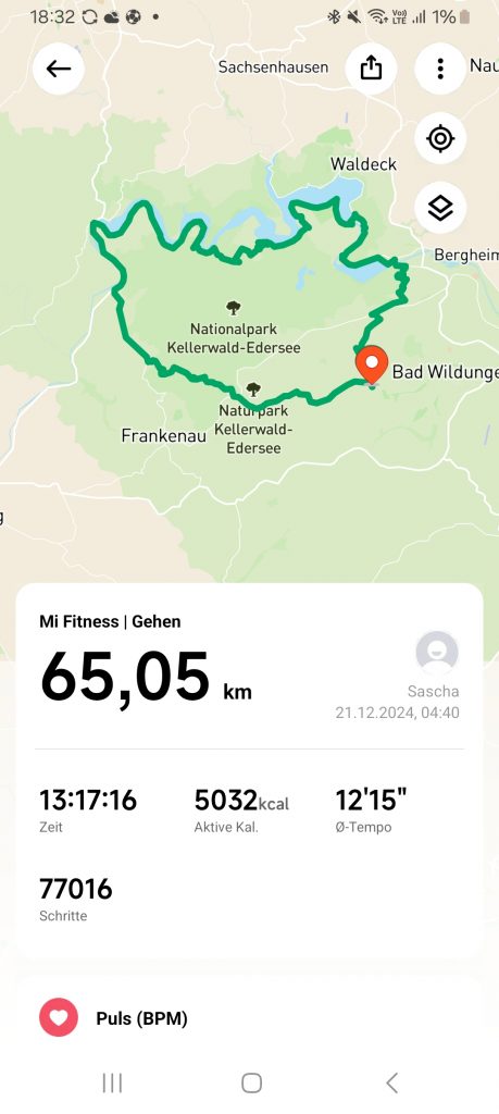Heute fühl ich mich nicht so gut. Ich glaube nicht, dass ich es schaffe, 35 Kilometer zu gehen, aber sicherlich schaffe ich noch 23.000 Schritte und dann erreiche ich an beiden Tagen 100.000 Schritte, ein wertes Ziel. Hier übrigens der Beleg für meine gestrige Wanderung. Ja, ich bin um 4.40 Uhr losmarschiert und habe um 18.30 Uhr die Sportschau anschalten können.