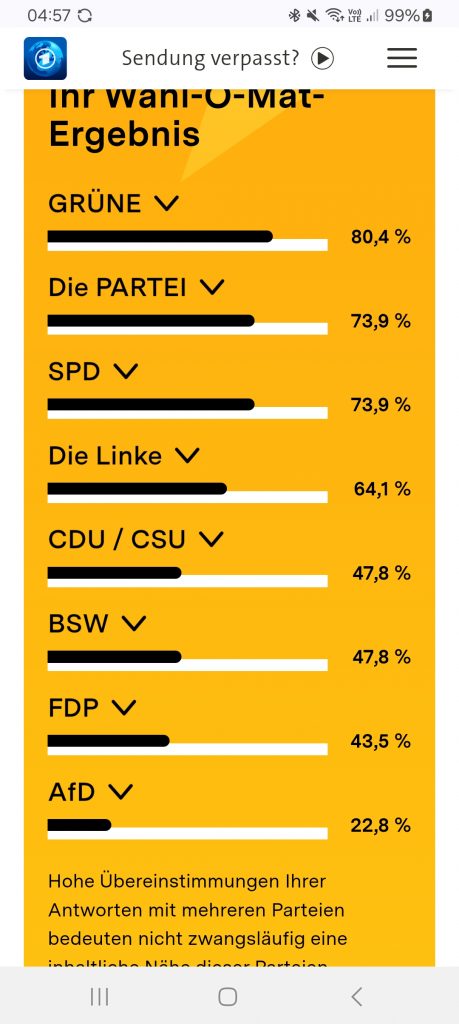 Ich habe den Wahl-O-Mat gemacht, denn er ist ja jetzt online. Große Freude. 38 Fragen und am Schluss die Gewichtung nicht unterschätzen. Hier ist mein Ergebnis.
