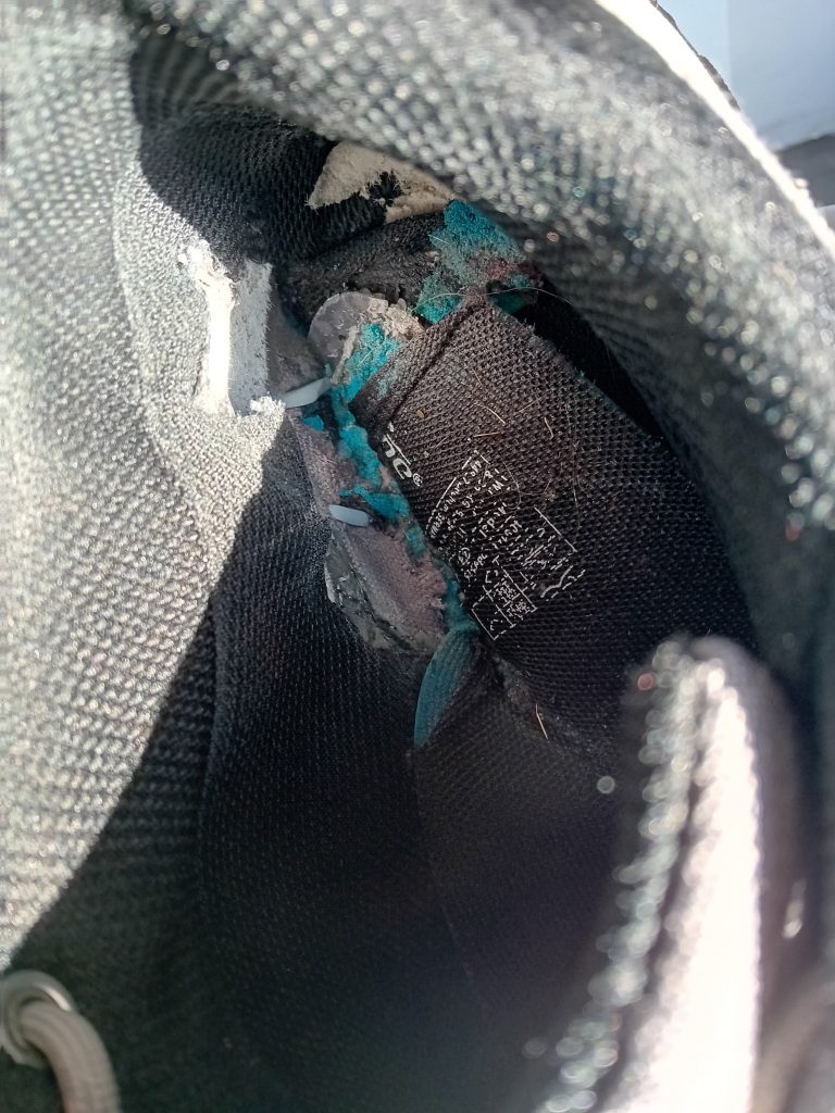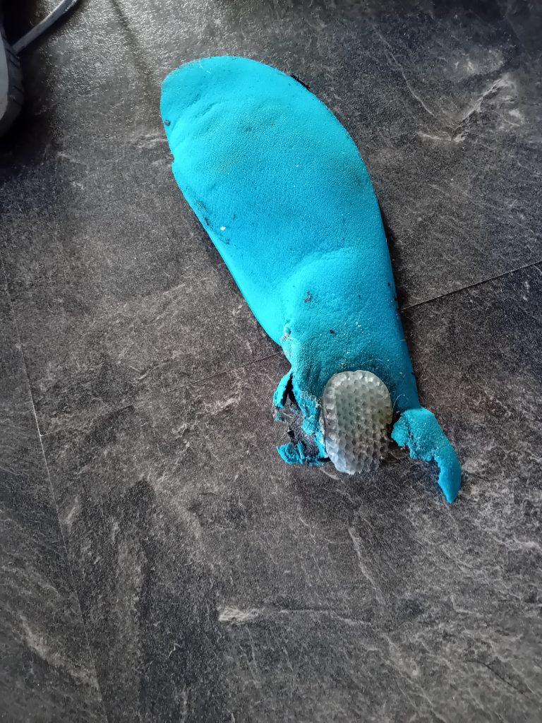 Hier ist die Einlegesohle, die ich für den linken Schuh genutzt habe. Davon ist nicht mehr viel übrig, weil sich im Innern der Stoff missbraucht hat und das Sohlen-Skelett durchkam:
