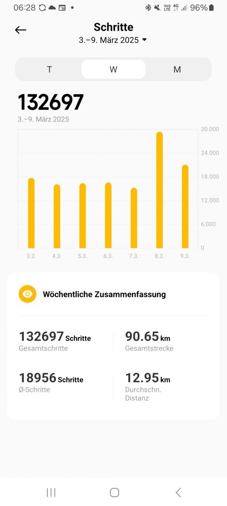 Heute habe ich bisher bei Minus 1 Grad Celsius 10021 Schritte erreicht, nach meinem Workout mit Gewichten. Letzte Woche bin ich auch viel gelaufen: