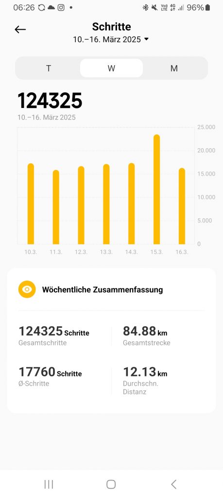 Heute habe ich bisher 8937 Schritte angesammelt (es ist jetzt 06:40 Uhr) nach meinem Workout mit Gewichten. Und letzte Woche war ich insgesamt recht aktiv: