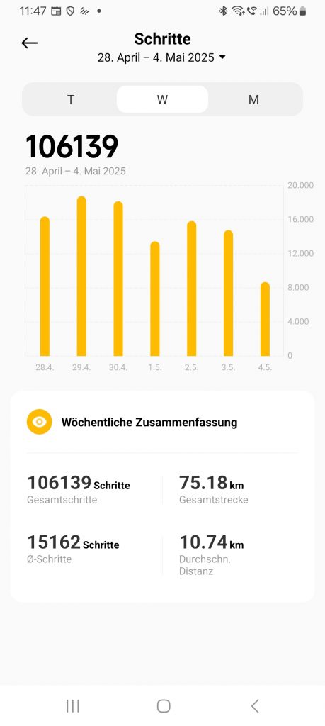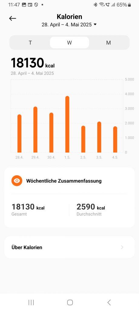 Und ich habe täglich mehr als 2500 aktive kcal verbrannt, was allerdings ein bisschen zu viel ist. Nächste Woche muss ich daher mal ein wenig runterfahren im Verbrauch.