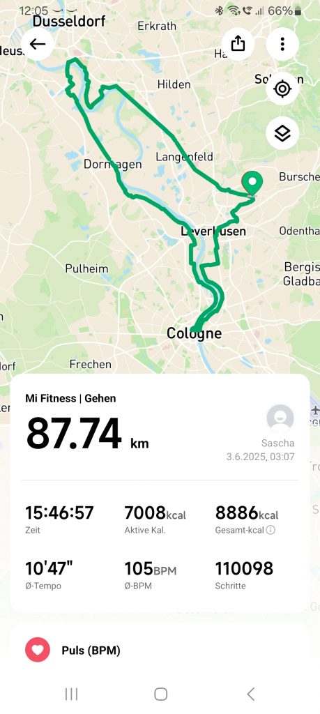 Ich bin nachts um 3.00 Uhr losmarschiert, habe meine Schuhe gewechselt und mir nur ein paar Blasen angelaufen. Ich habe Pausen bei Discountern gemacht und bei McDonald´s wo ich zwei Milkshakes getrunken habe mit einigen Brainfreezes. Die große Toilettenpause habe ich in einer Mall in Dormagen gemacht. Ich konnte weil ich ja gutes Licht über den gesamten Walk hatte das Tempo von fast 6 K pro Stunde gut aufrecht erhalten und bin noch bei Tageslicht wieder zuhause eingetroffen, sodass die Sorgen der Familie sich in Grenzen halten konnten. Trotz der nicht erreichten 100 Kilometer macht mich der Walk dennoch sehr zufrieden und natürlich auch die 7000 verbrannten Kilokalorien, die ich mit ungesunden Snacks wie Bockwürstchen mit Brioche-Brötchen, Snickers-Eis, natürlich in White und den besagten Milkshakes versucht habe auszugleichen. Ich habe 5 Liter Flüssigkeit (Milk-Shakes inklusive) zu mir genommen.